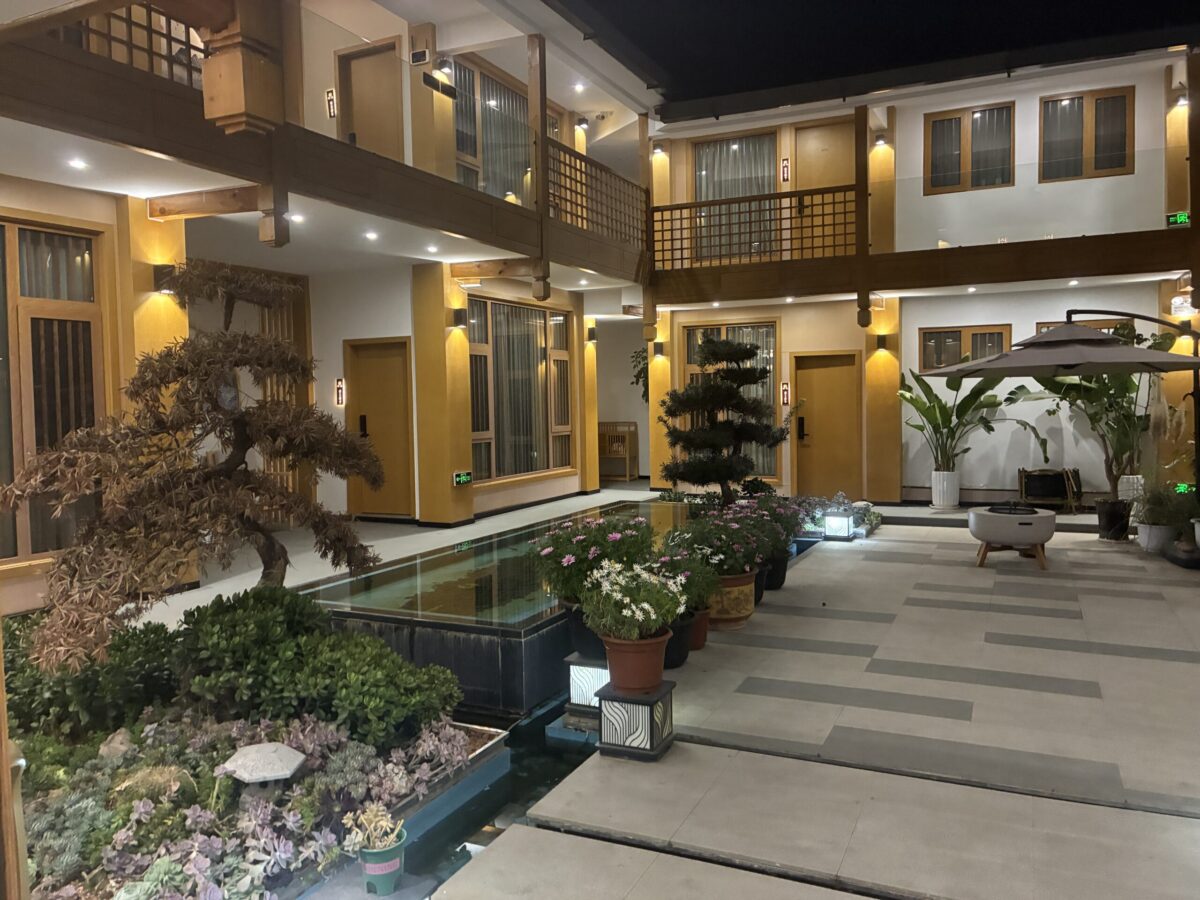ホテルは麗江古城エリアに位置し、日本の和風建築を思わせる落ち着いたデザインを取り入れたホテルです。中庭を中心とした空間構成で、木や石を基調とした内装が静かな雰囲気を演出しています。